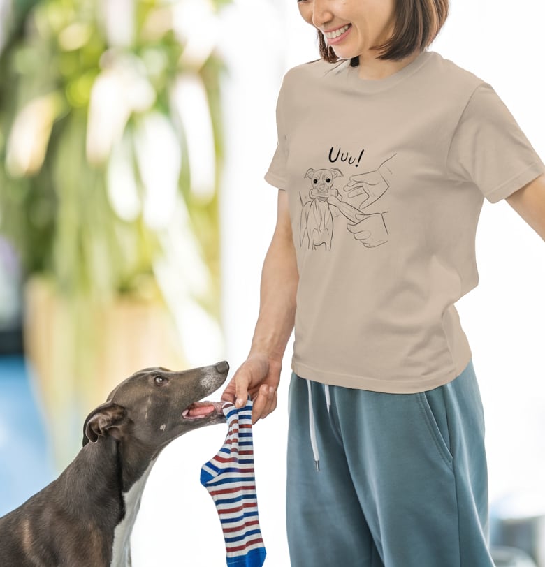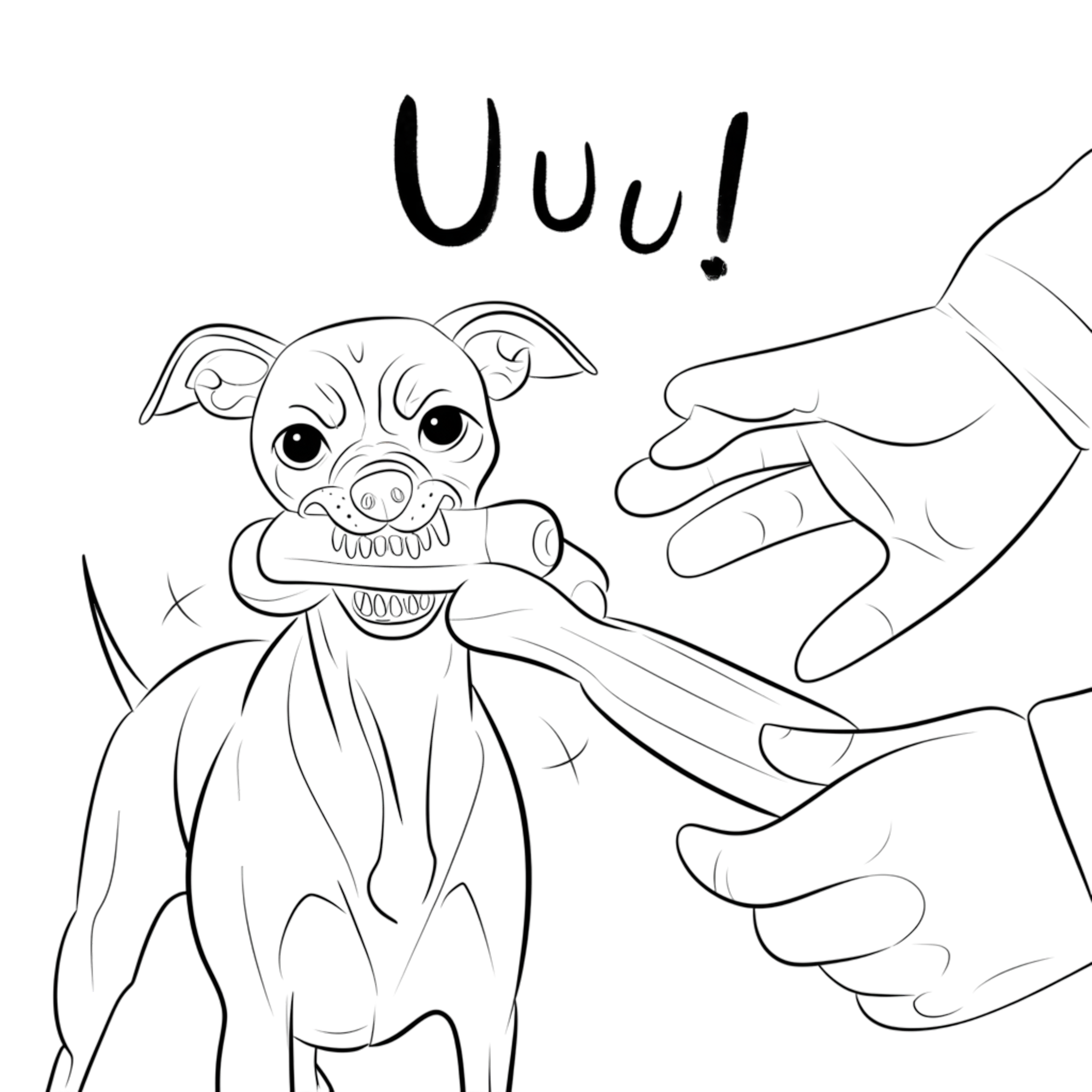 イタグレがお気に入りの靴下を取られそうになり、歯をむき出しにして対抗している様子をデザインいたしました。