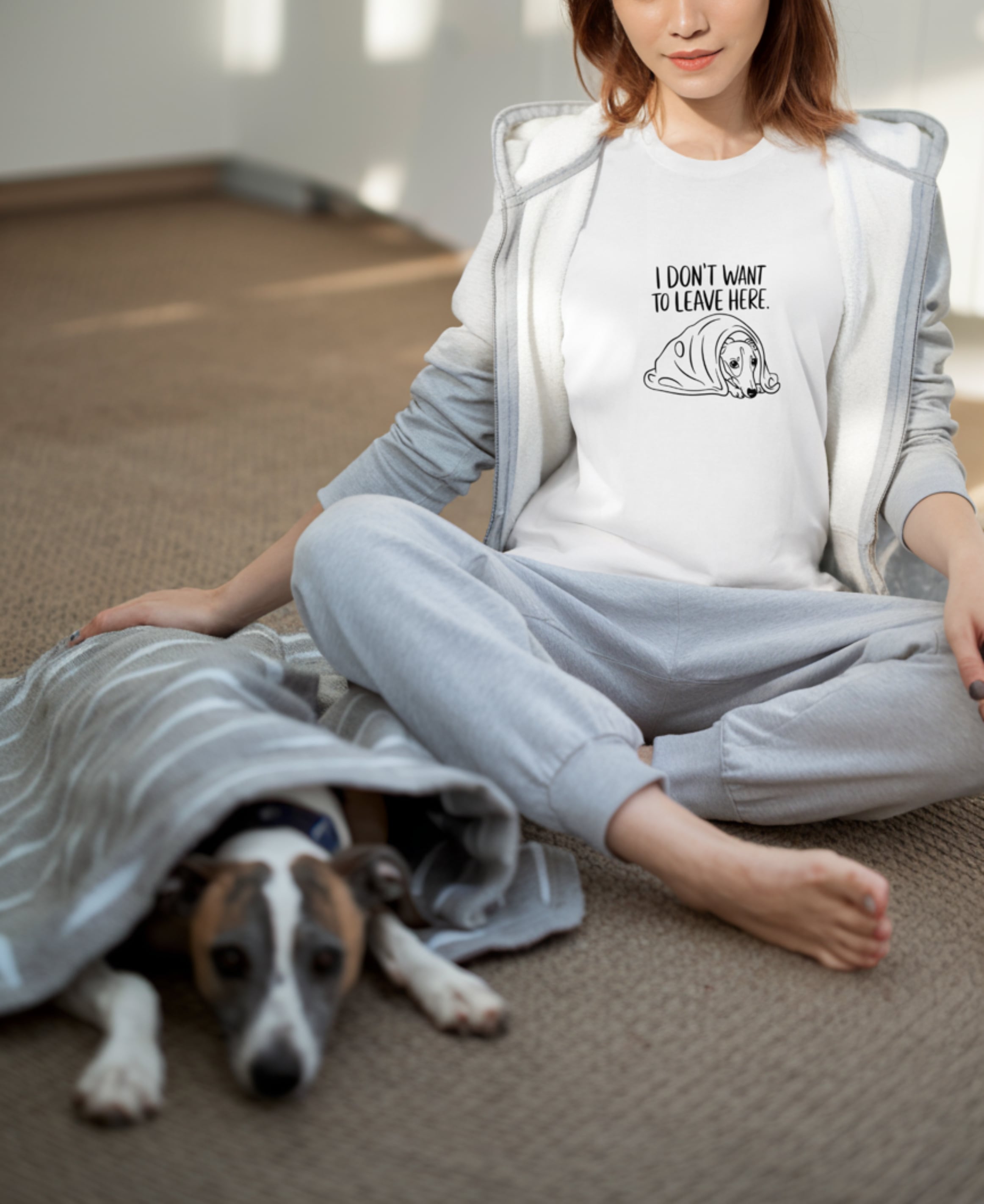 イタグレが毛布にくるまり、「ここから出たくないよ」と顔だけ出してこちらを見つめている様子をデザインいたしました。