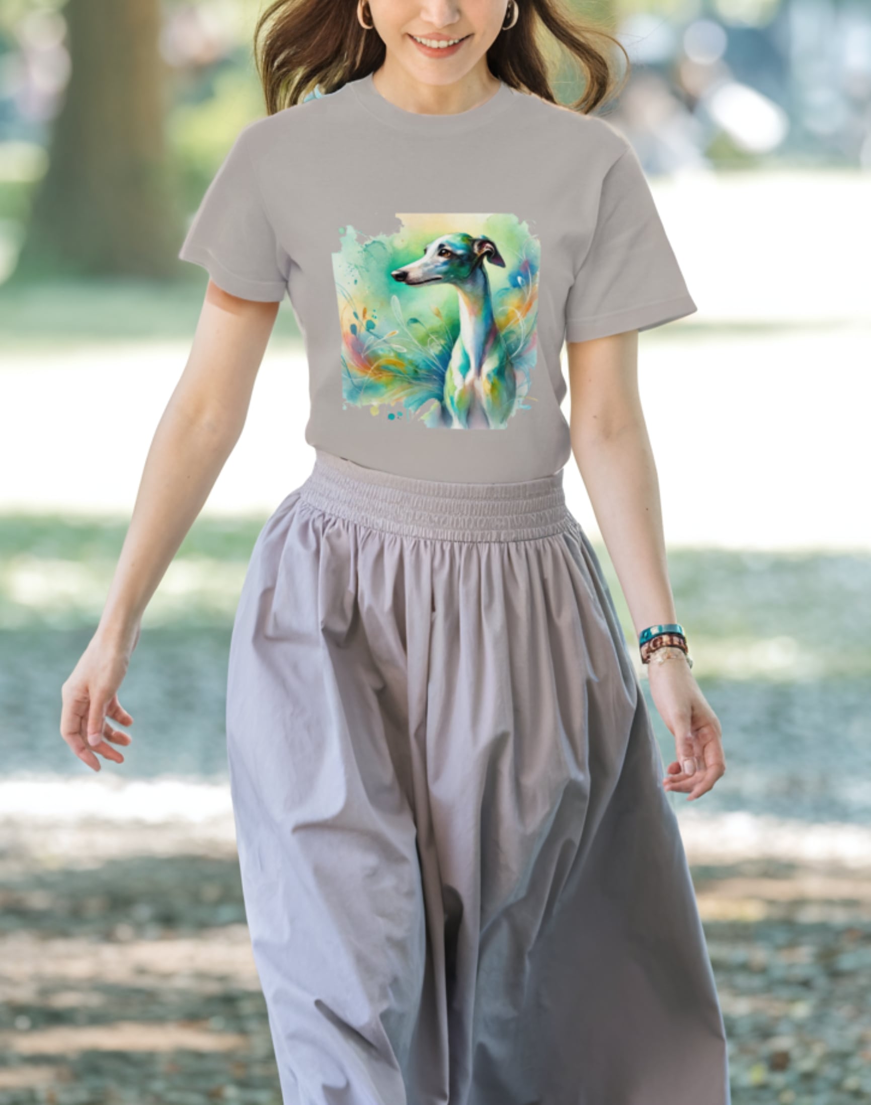 美しいイタリアングレーハウンドを繊細なタッチで描き、水彩風のカラフルなアートと組み合わせた唯一無二のデザイン。