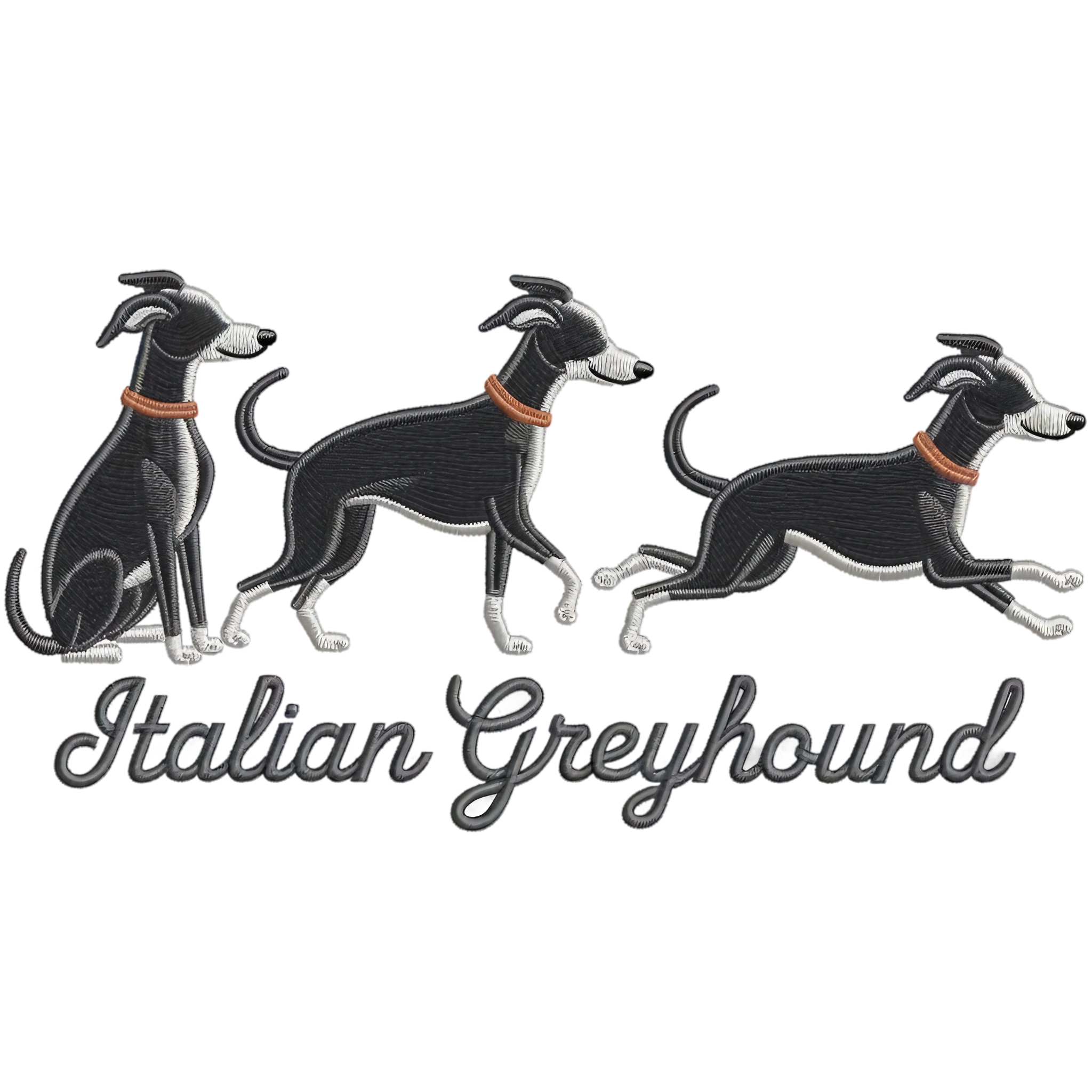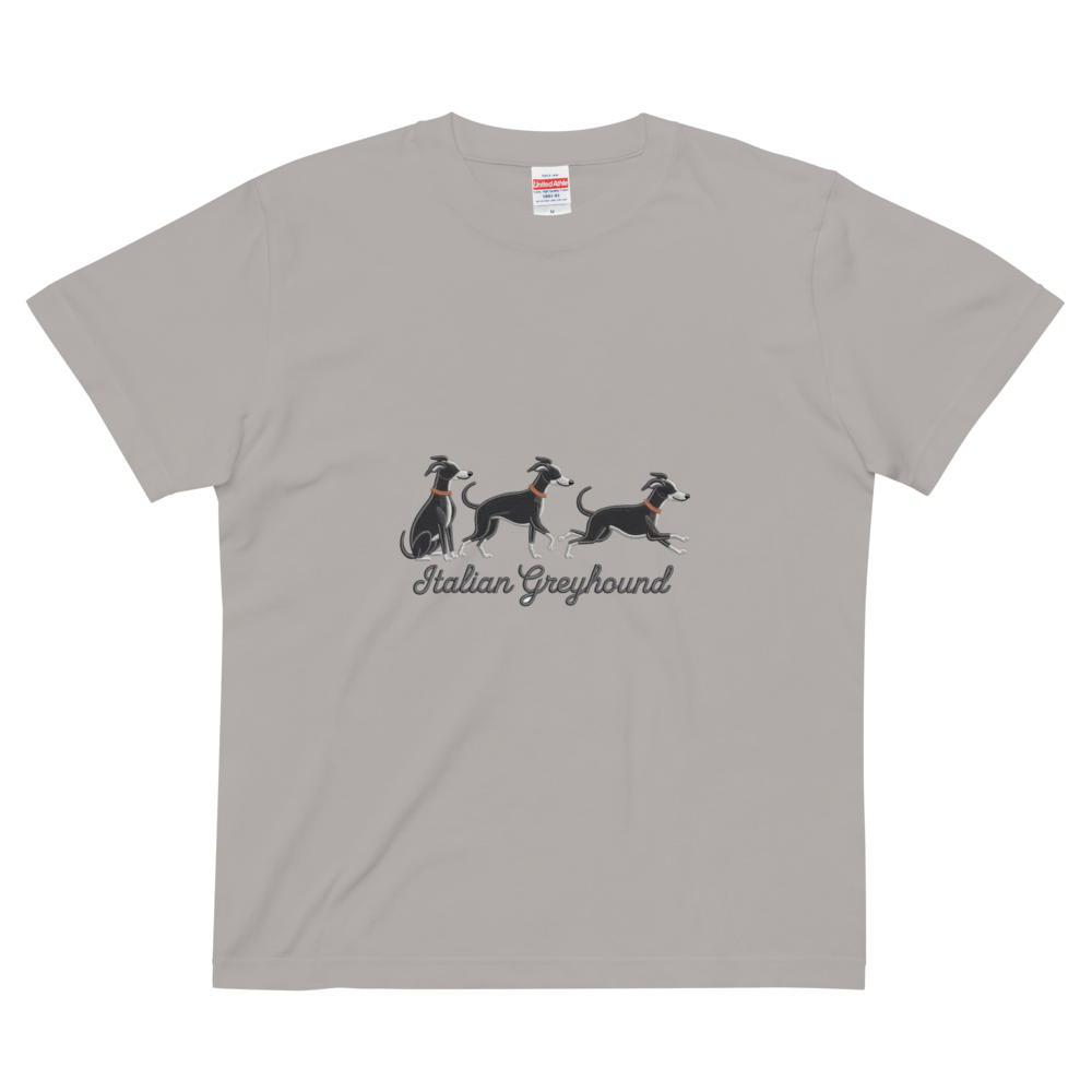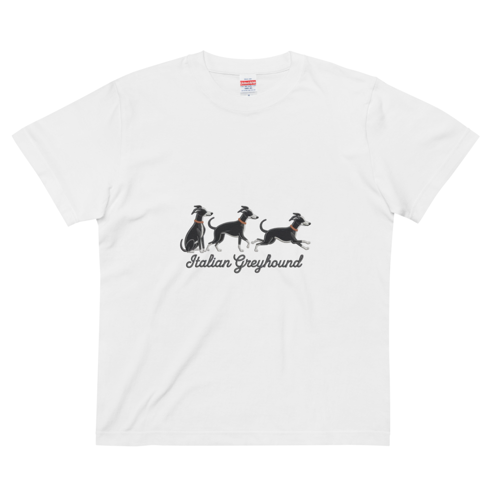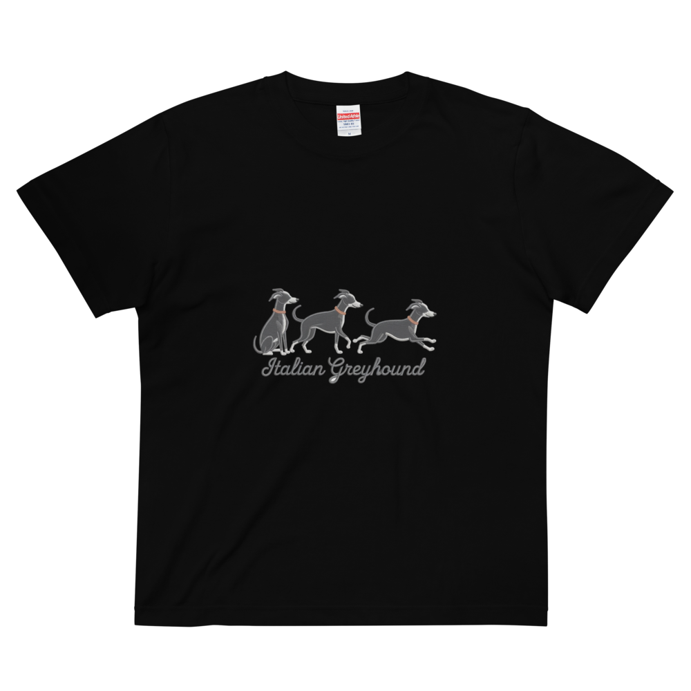ブラックのイタグレがお座り、歩く、走っている姿を、刺繡のようなイラストタッチでデザインいたしました。綿100%で着心地がよく、長持ちするアイテムです。