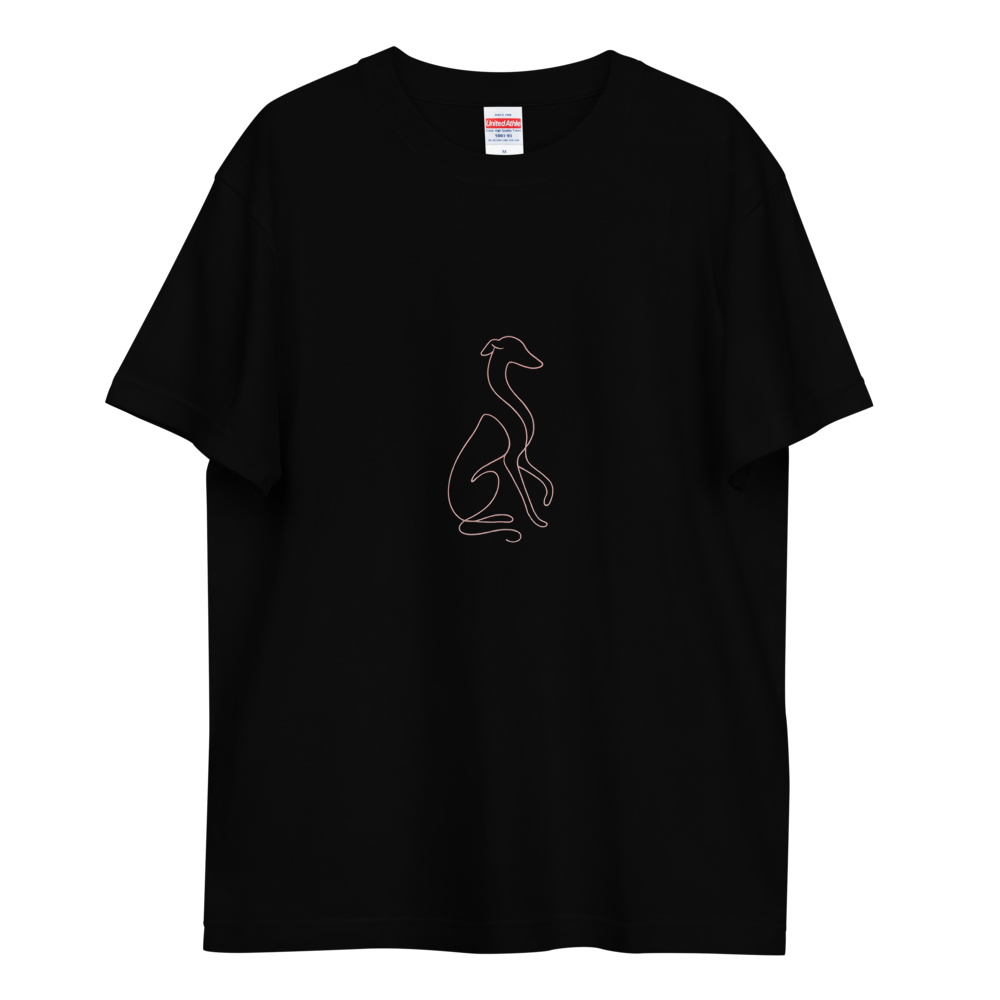 淡いくすみピンクの線画は、Tシャツのアクセントとして程よく映え、犬好きな方にも、アート好きな方にも。