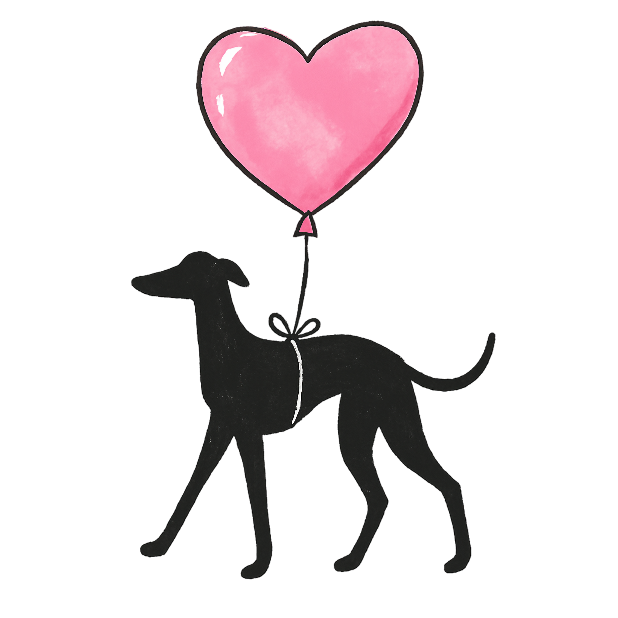 ピンクのハートバルーンに結ばれたイタグレのシルエットが、