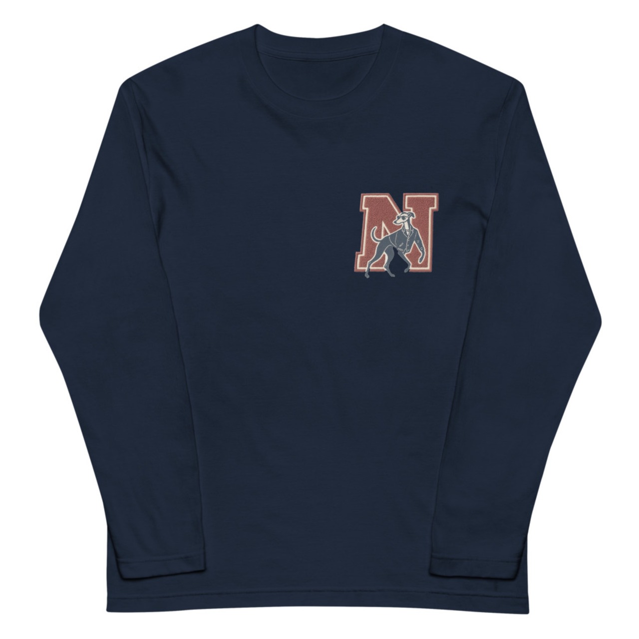 レトロな「N」の文字と、ジャケットを着こなすイタグレがワンポイントであしらわれています。