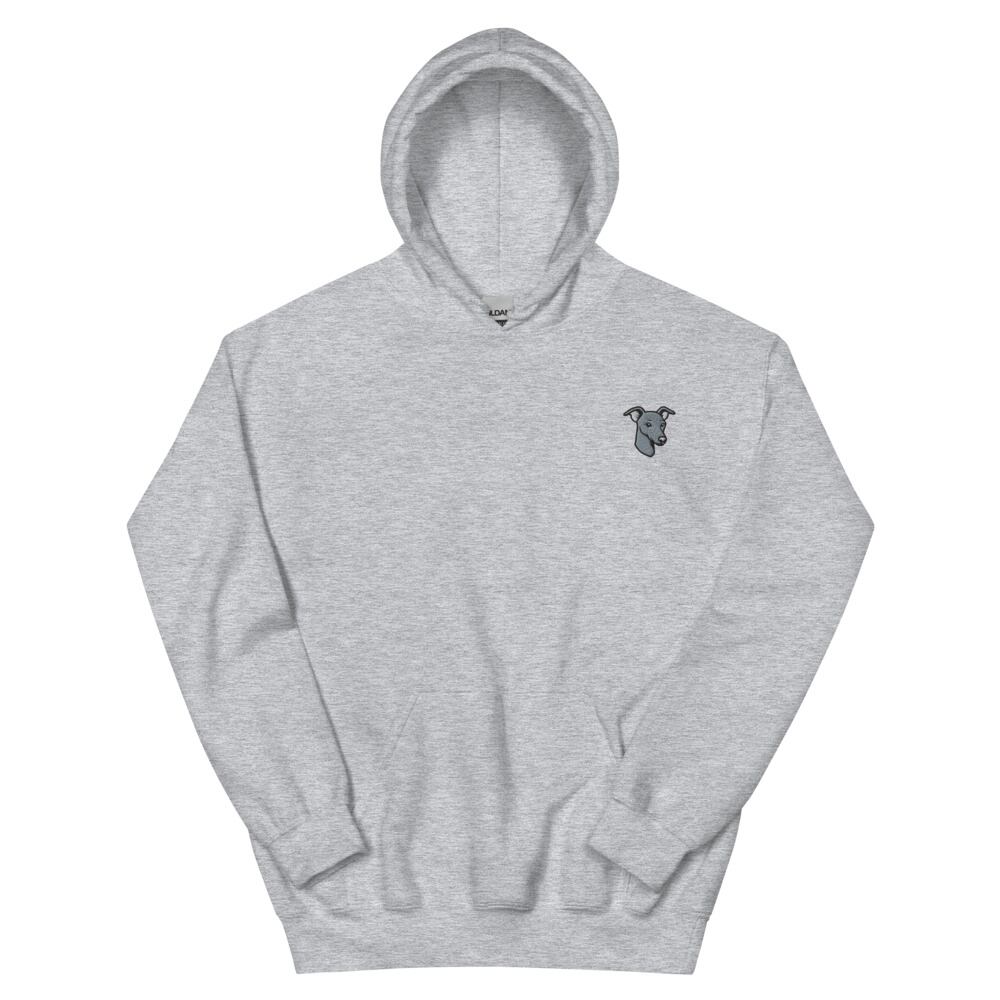 イタグレの愛らしい表情を、胸元にワンポイント刺繍であしらったパーカーです。