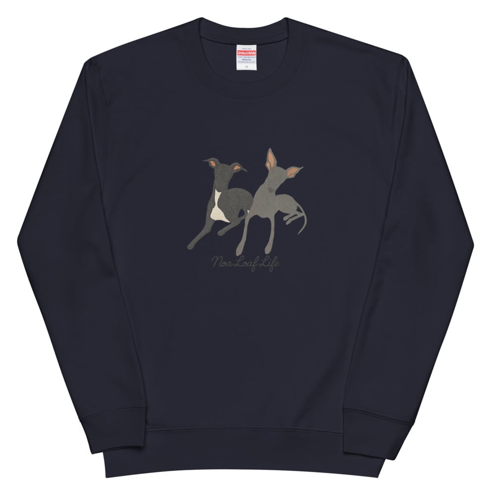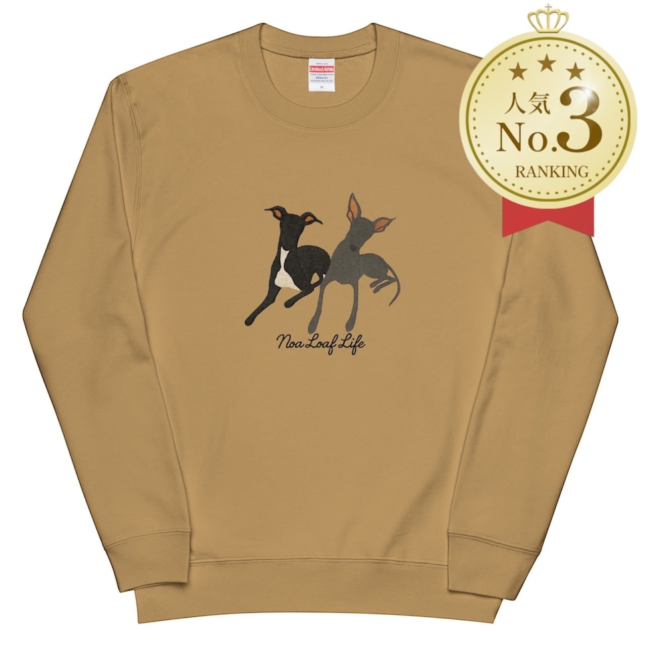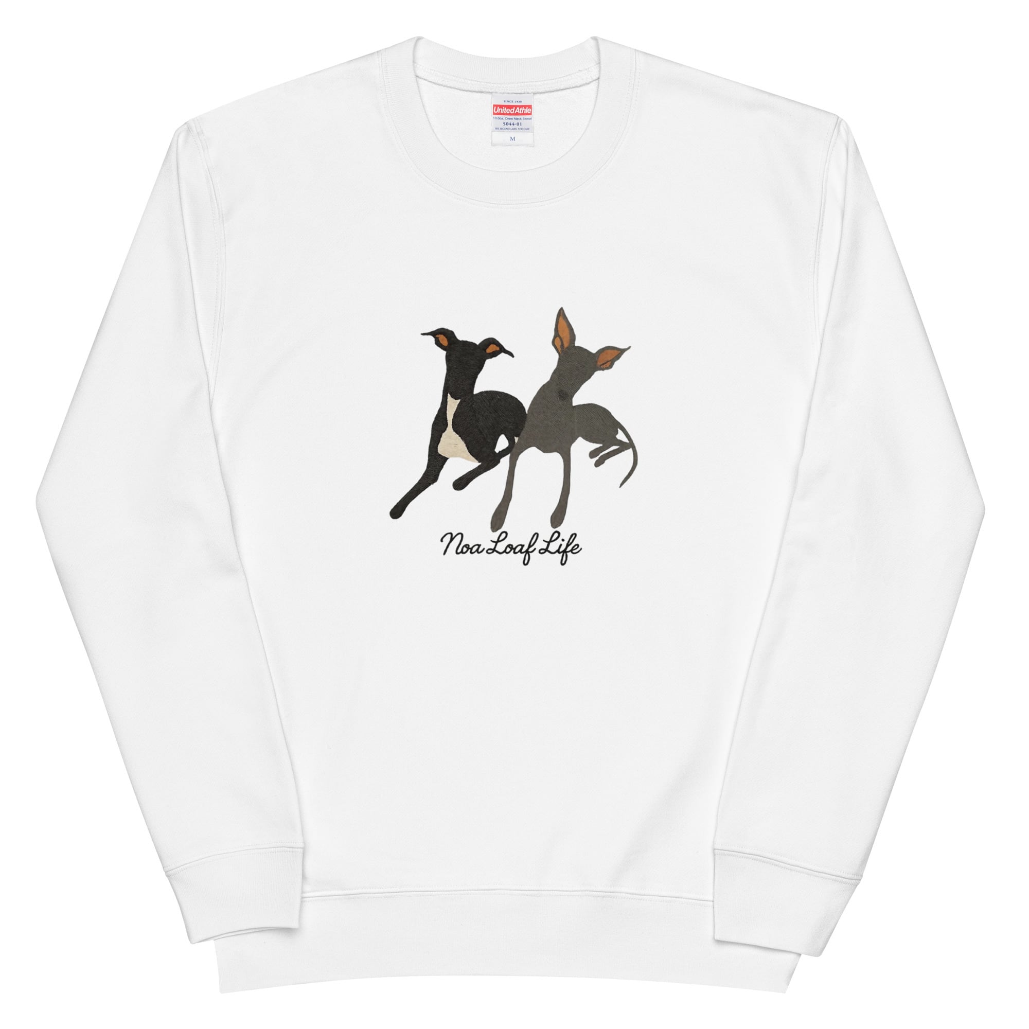 仲良く並んでくつろぐ2頭のイタグレを刺繍風に表現したスウェット。