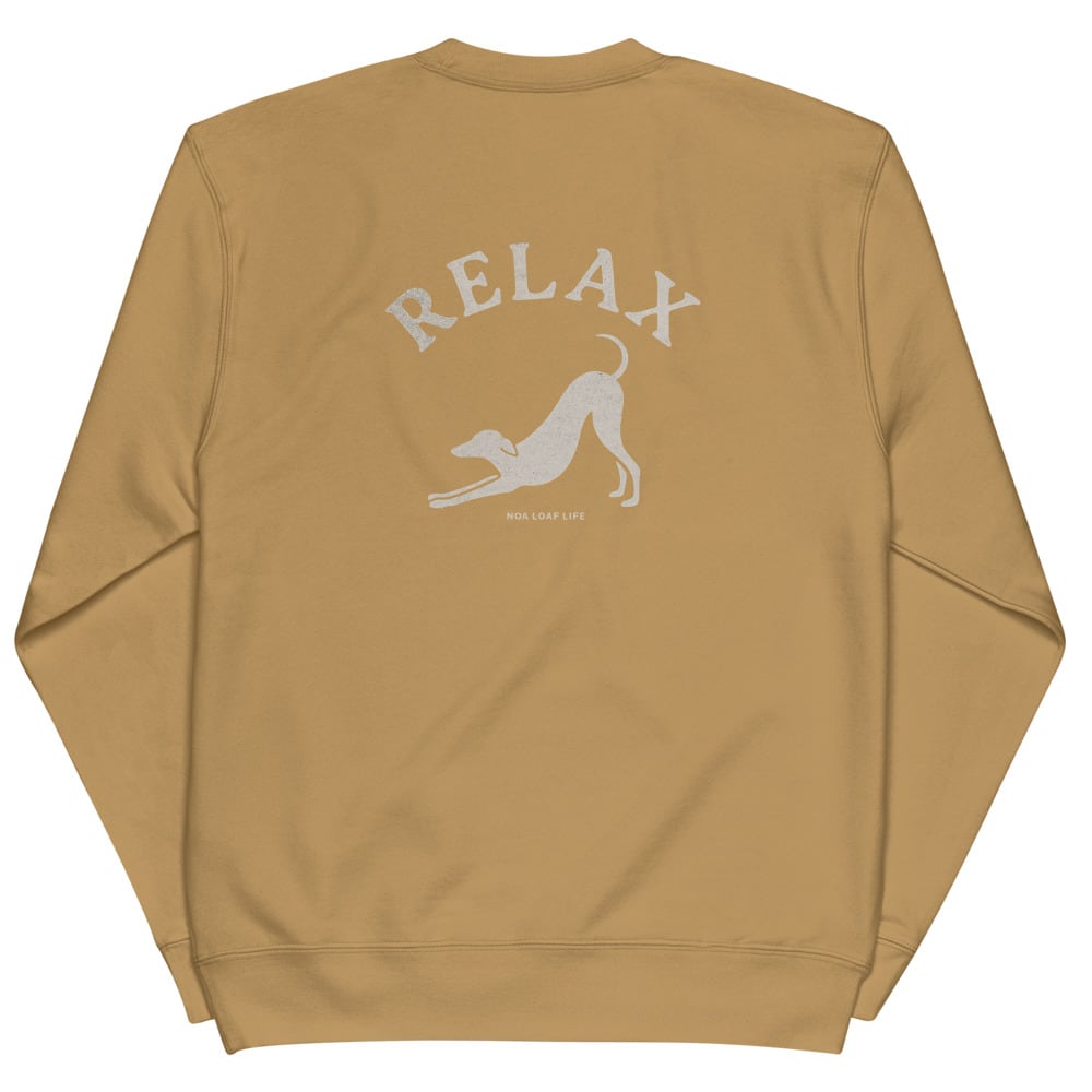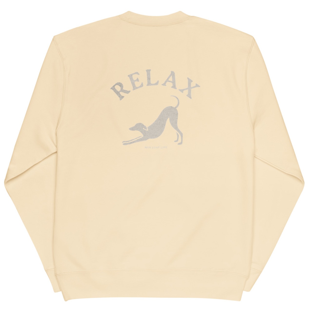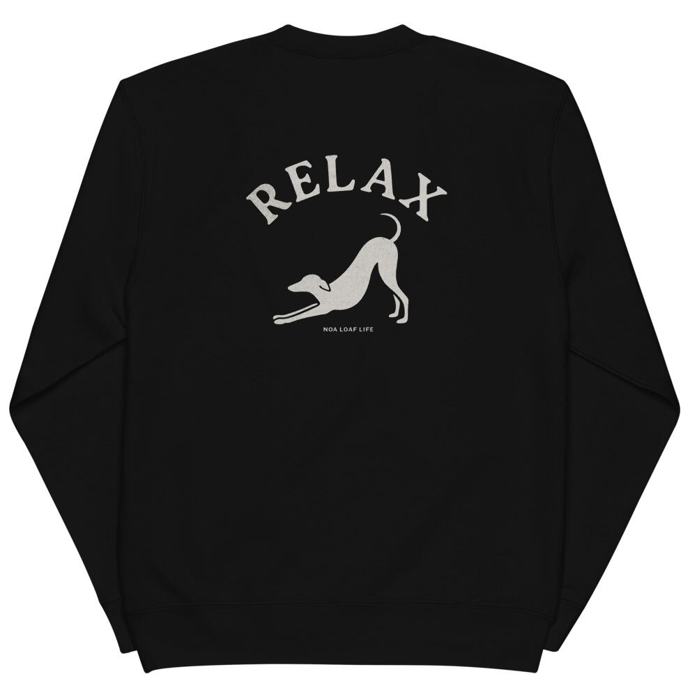 背中には「RELAX」のメッセージと、ストレッチポーズをするイタグレのシルエット。