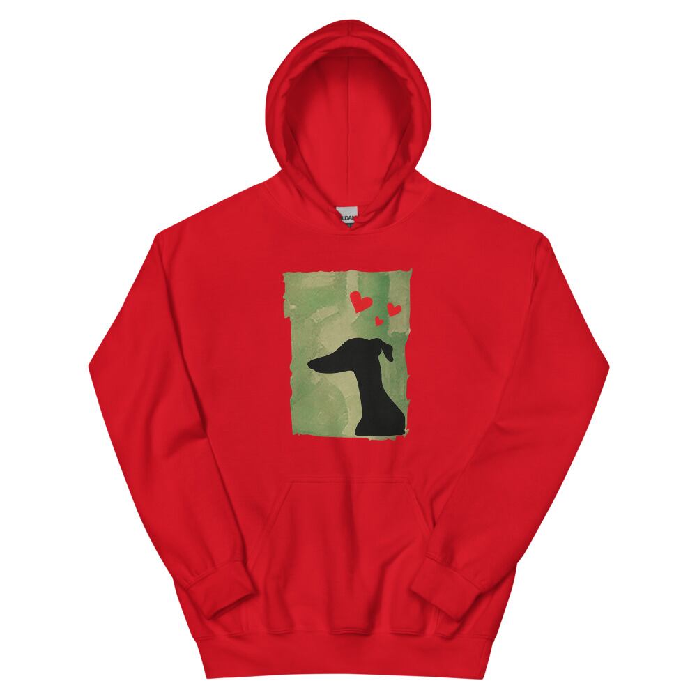 淡いグリーンのテクスチャに、イタグレのシルエットと浮かぶハートがアクセントになったアートデザイン。