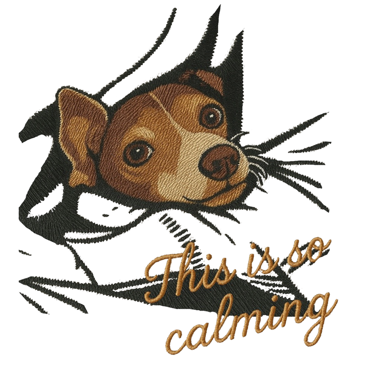 愛犬のぬくもりの中の幸せ時間を刺繍風で丁寧に描いたデザイン。