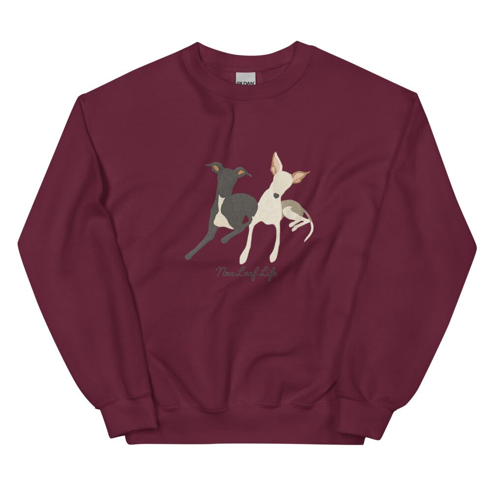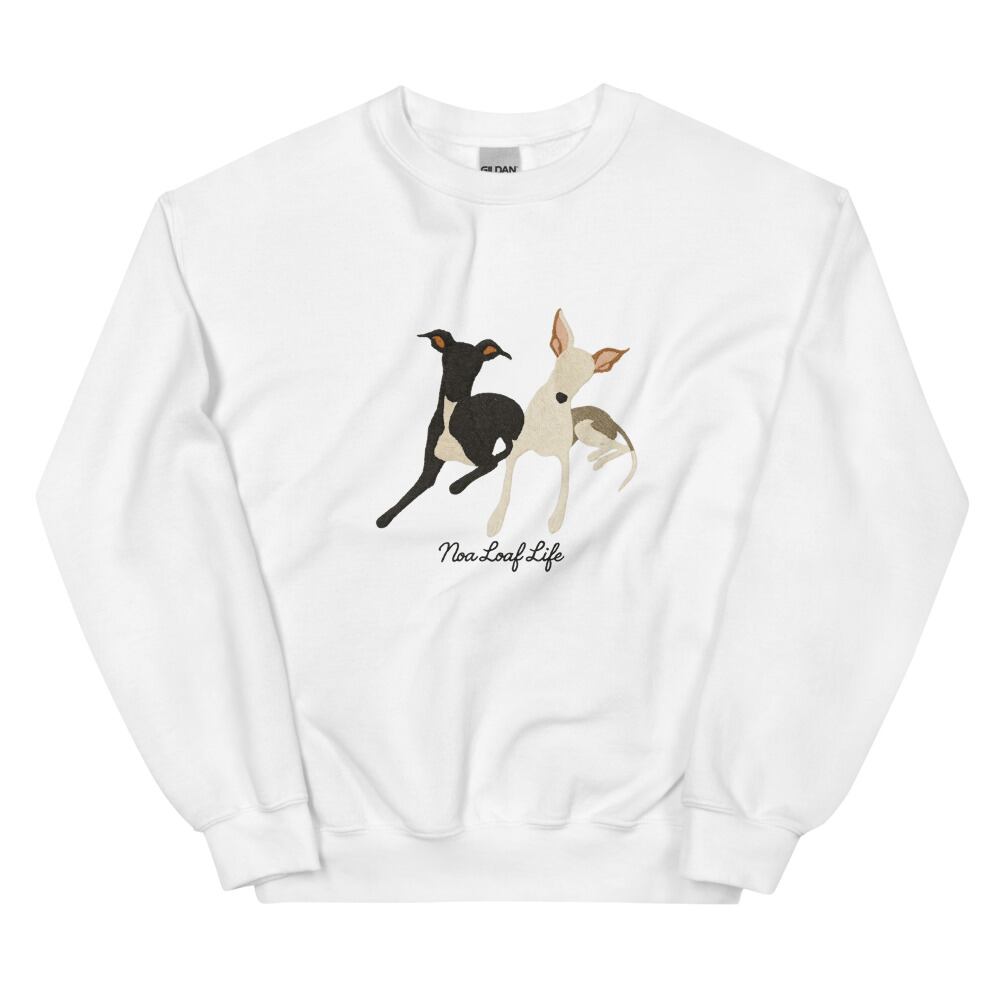 仲良く並んでくつろぐ2頭のイタグレを刺繍風に表現したパーカー。