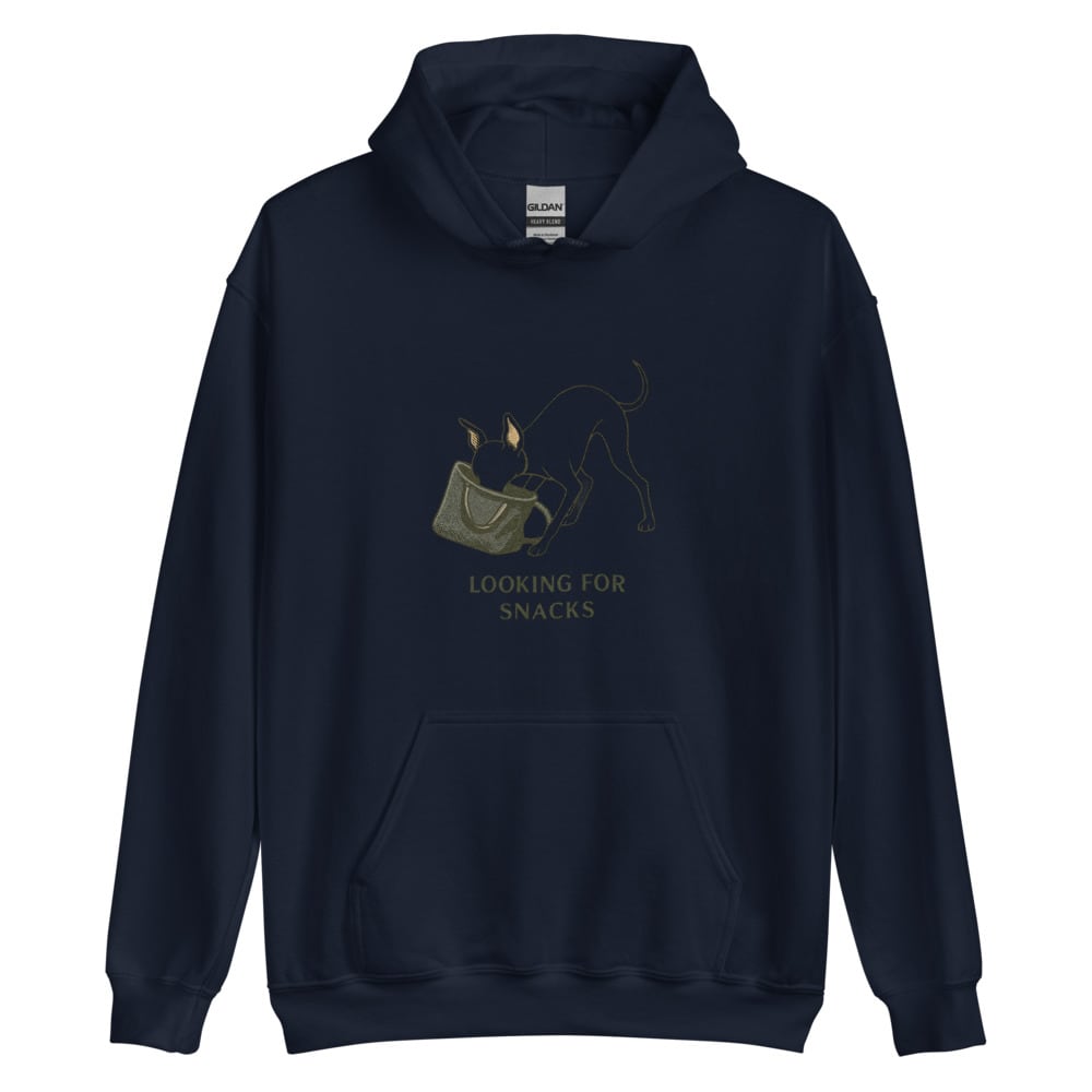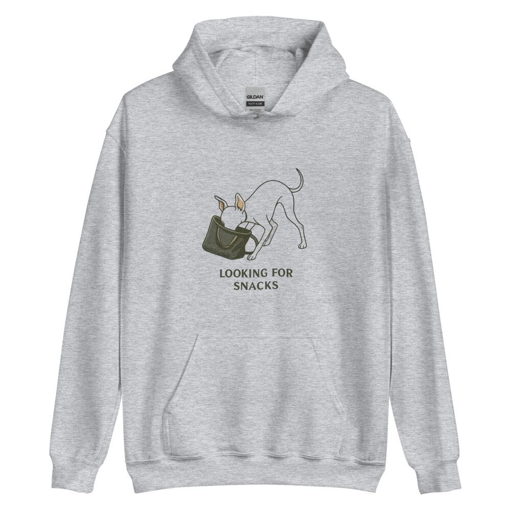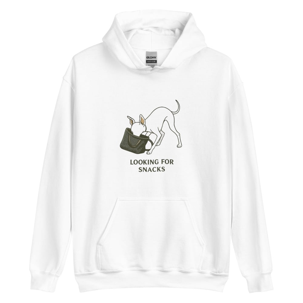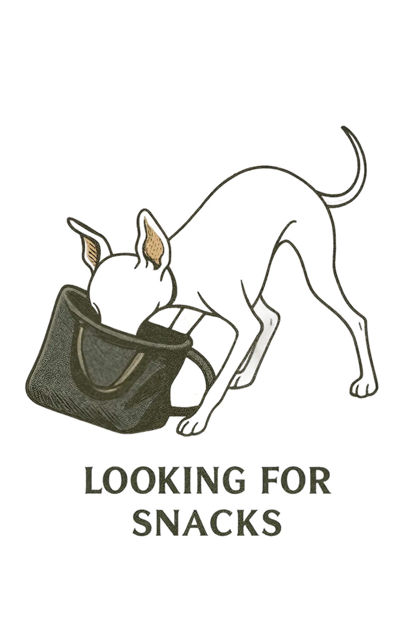 バッグの中に顔を突っ込んで、“おやつ捜索中”なイタグレを描いたユーモアあふれるデザイン。
