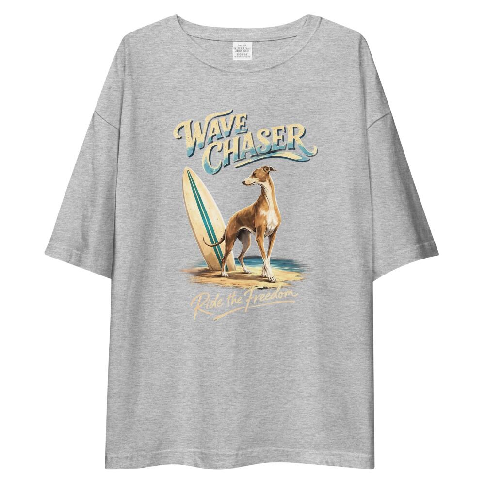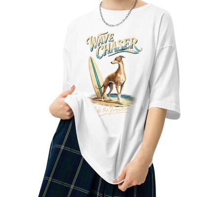 サーフボードの横で凛と立つイタリアングレーハウンド。