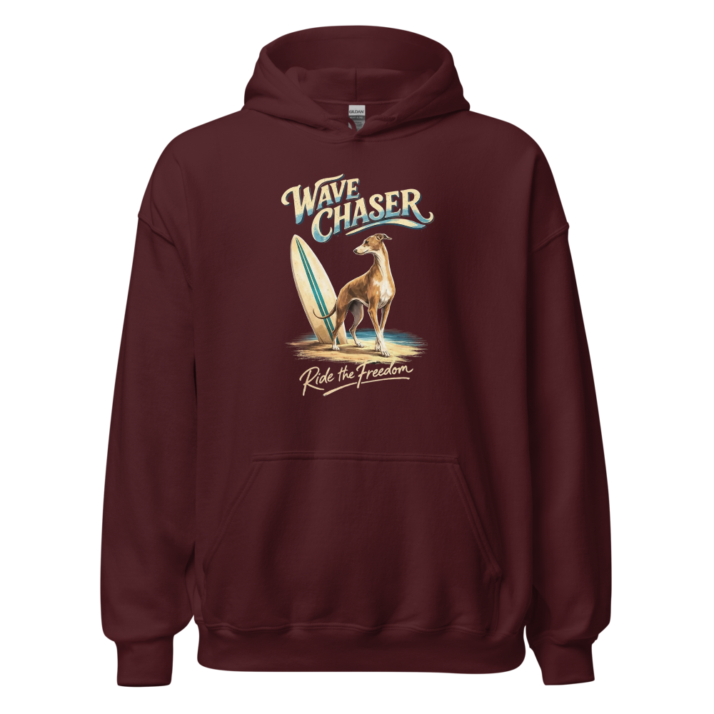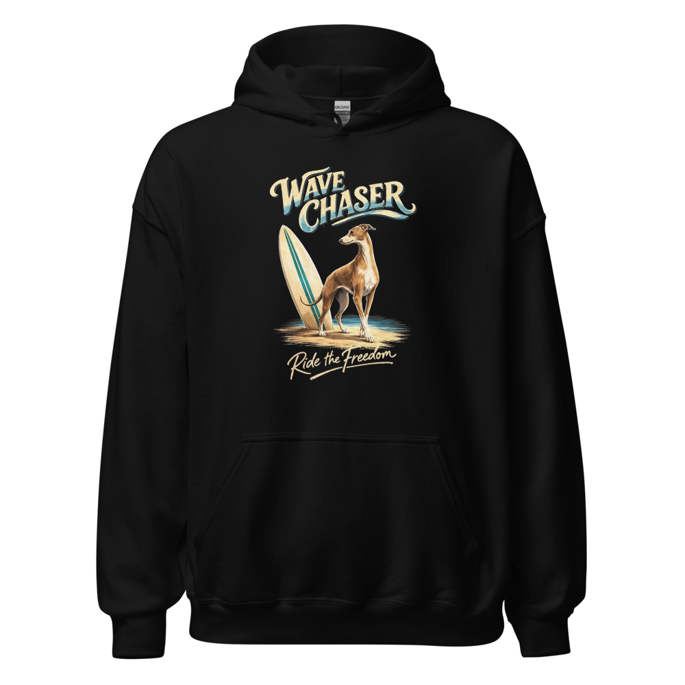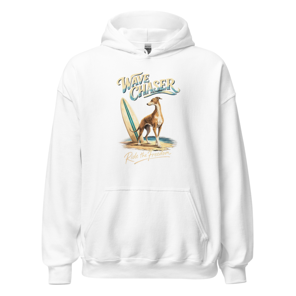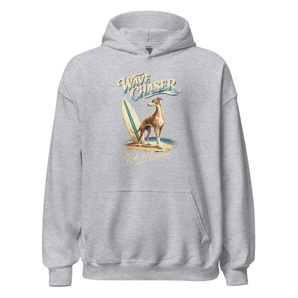 サーフボードの横で凛と立つイタリアングレーハウンド。