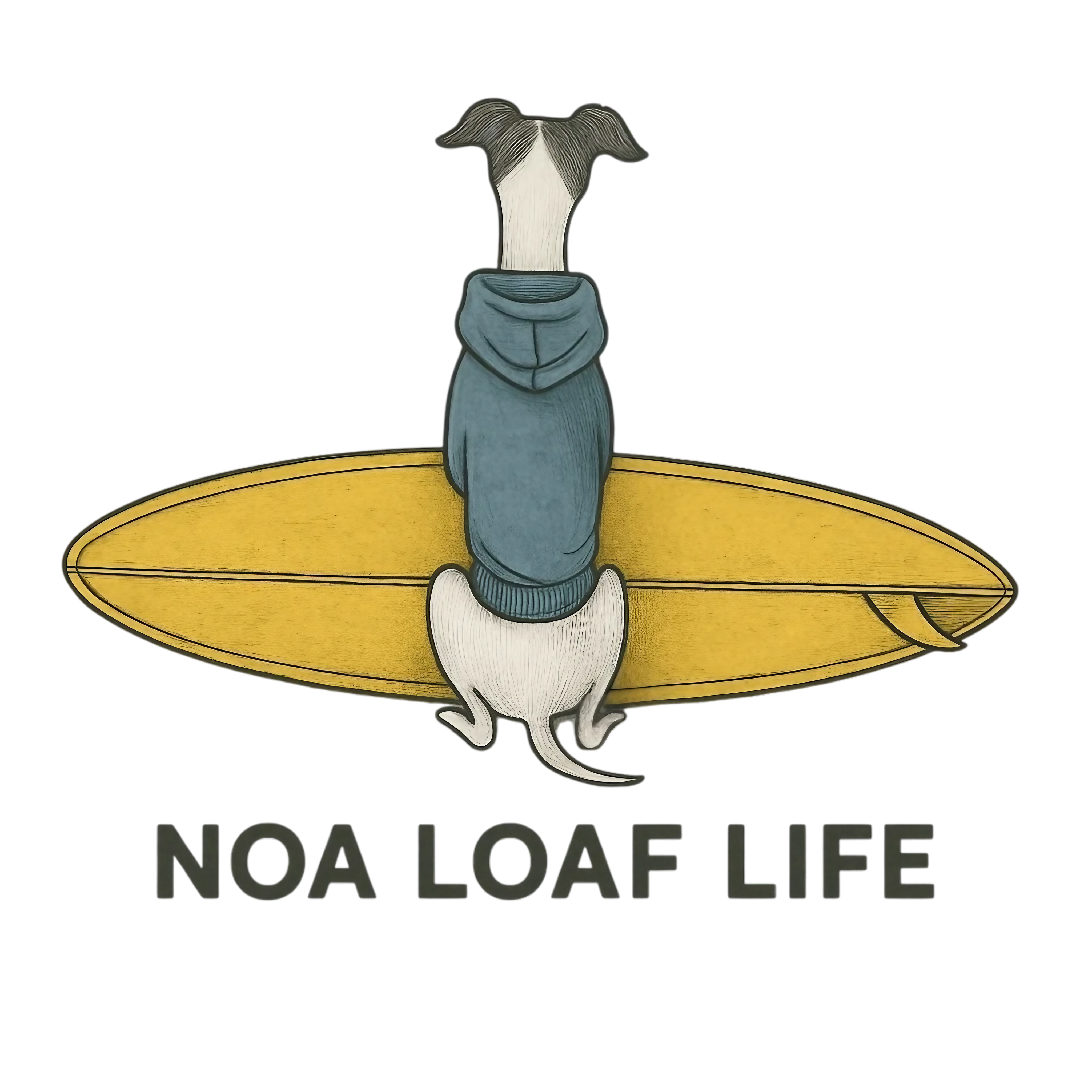 サーフボードを前にちょこんと座るイタグレ。