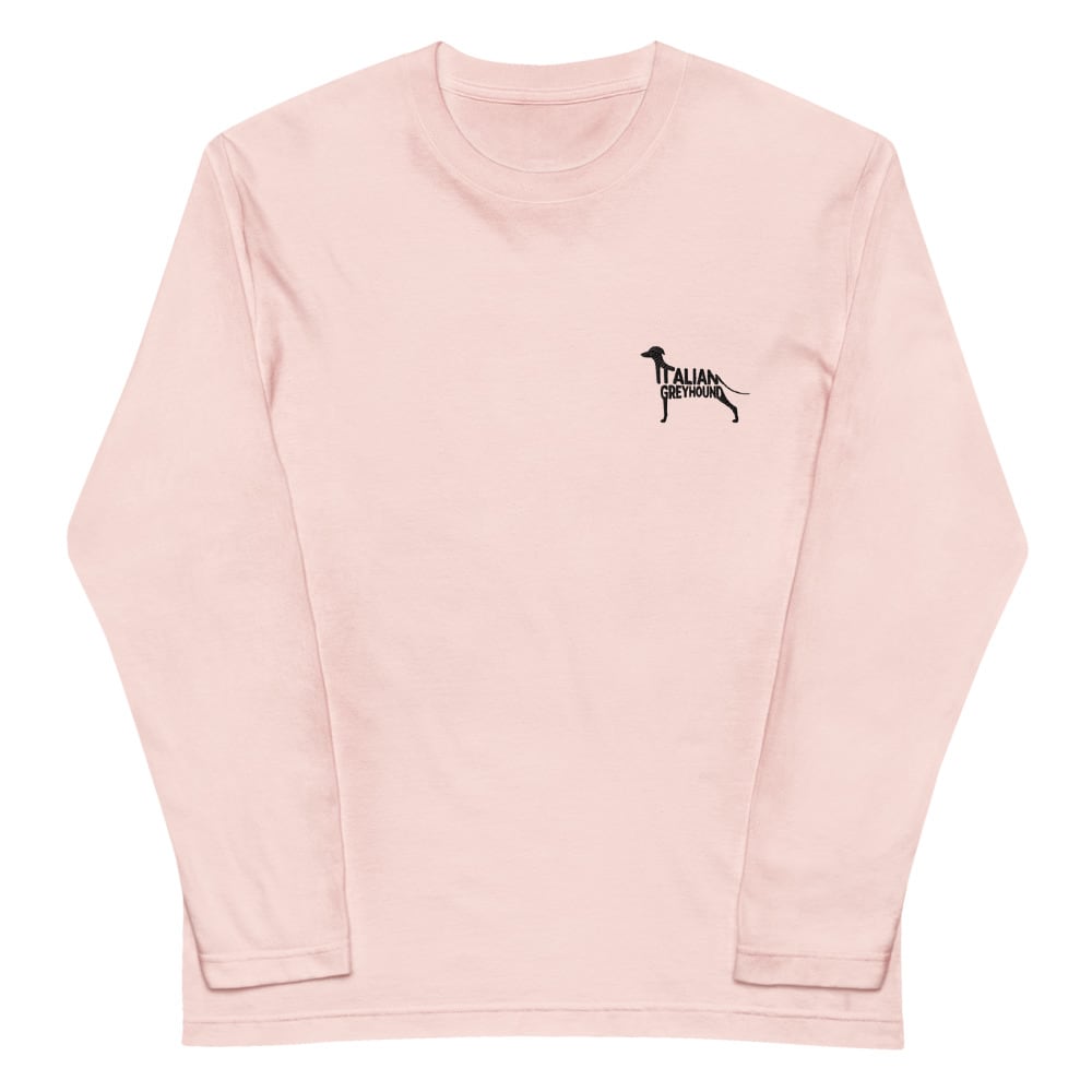 愛らしいボディラインに「ITALIAN GREYHOUND」の文字を重ねた刺繍風プリントが、シンプルなアイテムに上品なアクセントを加えます。